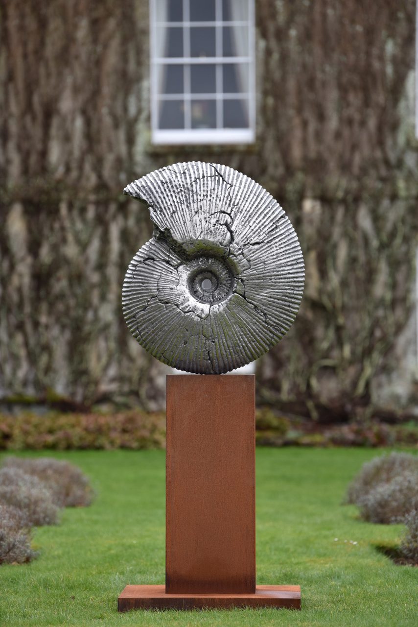 This sculpture is Hamish’s interpretation of a Jurassic ammonite fossil. The spiral shape of the fossilised shell is horn-like, and the term ammonite refers to the Egyptian god Ammon who wore the coiled horns of a ram.