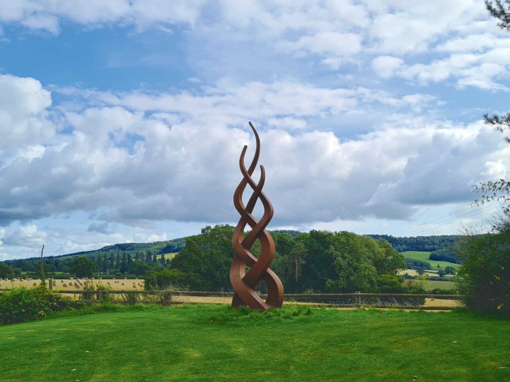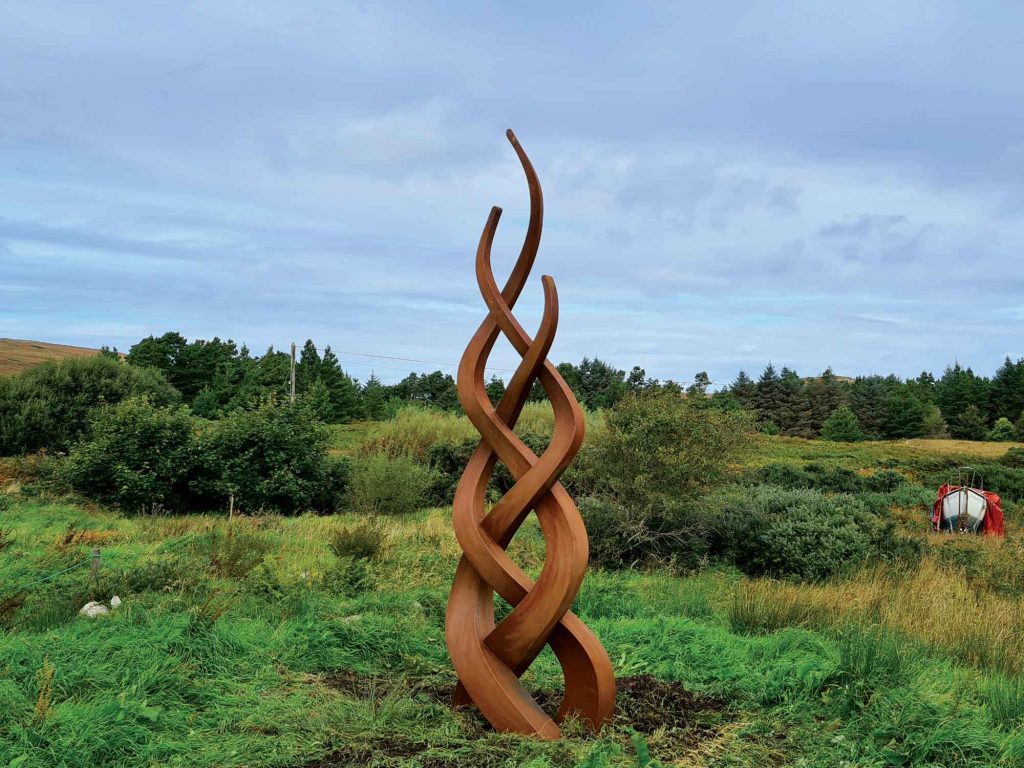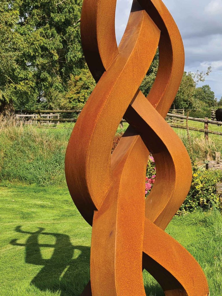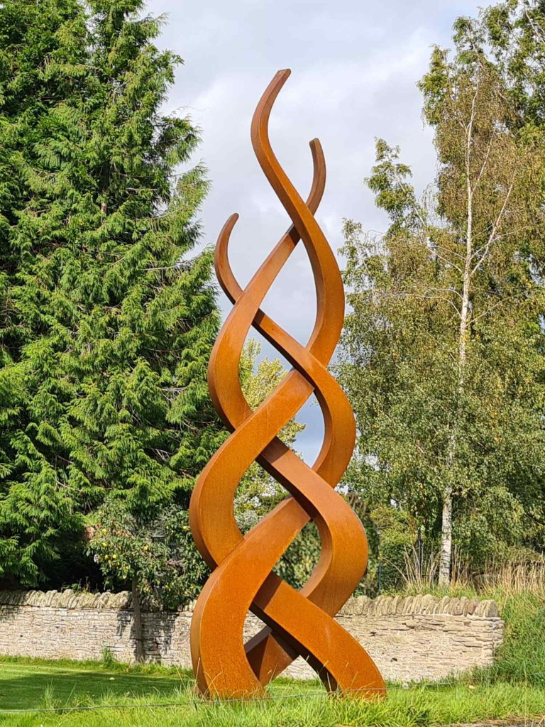 This elegant contemporary steel sculpture features sweeping, ribbon-like curves that rise and intertwine gracefully into the air. Its flowing form creates a sense of movement and balance, while the warm rusted patina adds natural texture and depth. Bold yet tranquil, this striking piece brings a timeless sense of serenity and architectural beauty to the landscape.