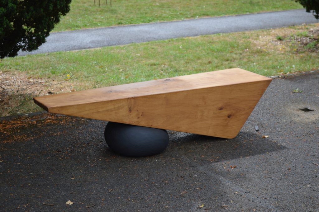 The design plays with the idea of equilibrium — the sharply defined timber contrasts with the smooth, organic support beneath, creating a sense of tension that is carefully resolved through balance. Despite its dynamic form, the bench offers a stable and inviting place to sit.