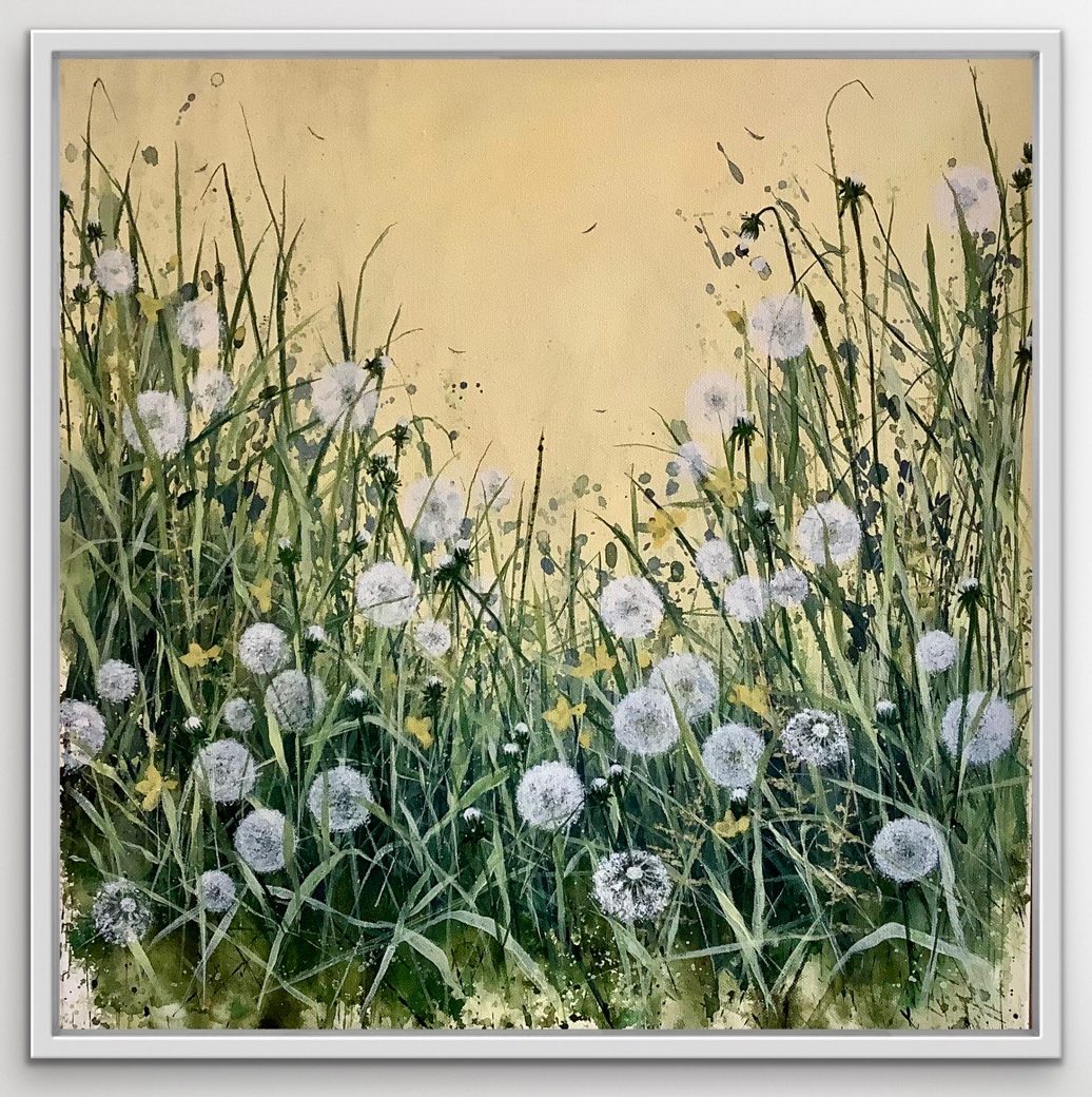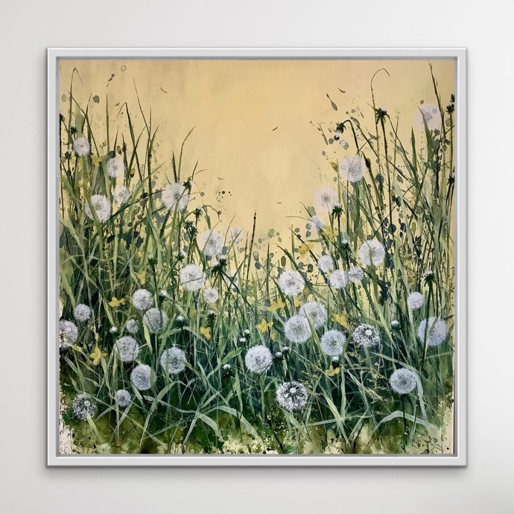 Acrylic and acrylic ink on canvas in a white boxed frame.
