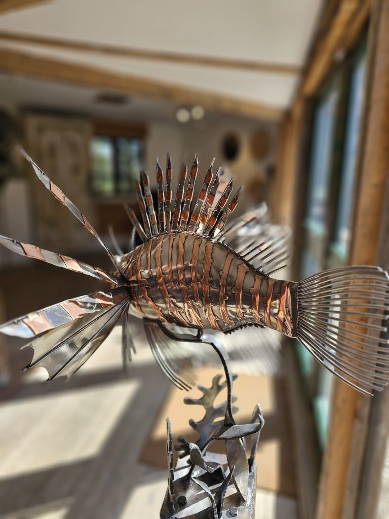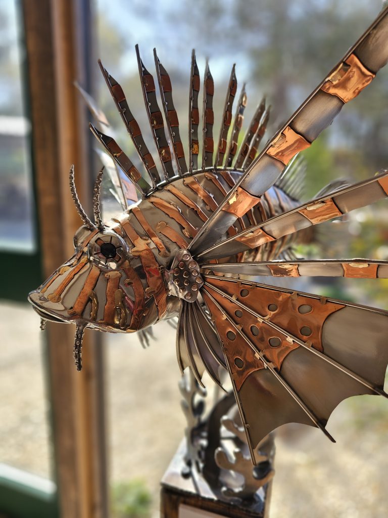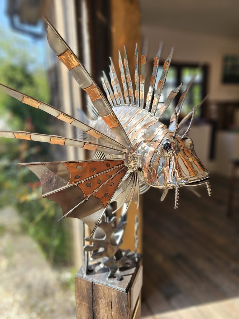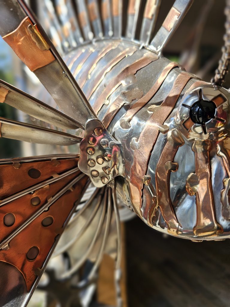 A detailed metal sculpture of a lionfish, constructed from polished marine steel with copper accents. The body has a smooth, reflective finish, contrasted by the radiating fins formed from cut and shaped metal elements that extend outward in a spiked, fan-like arrangement.