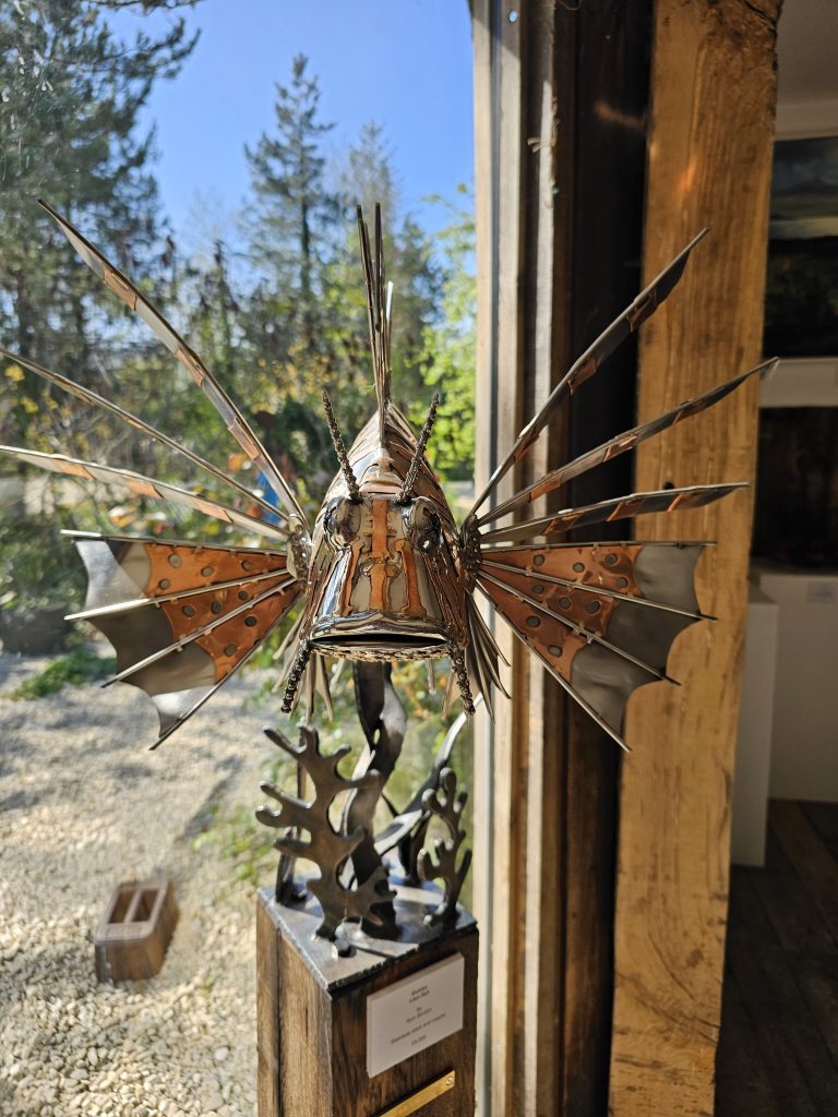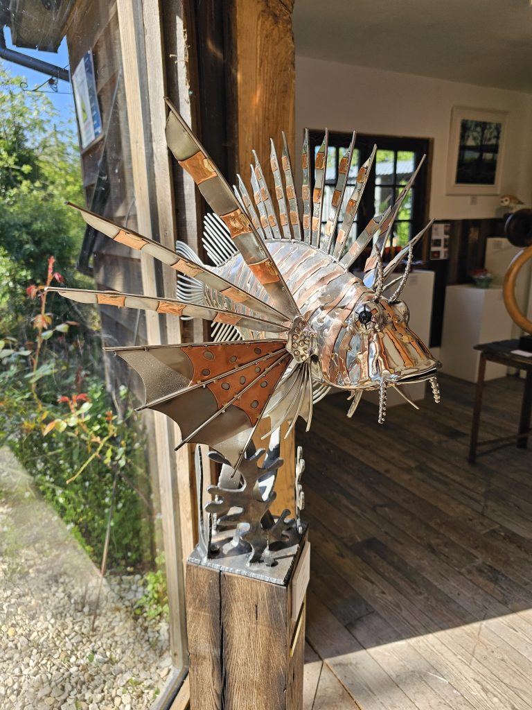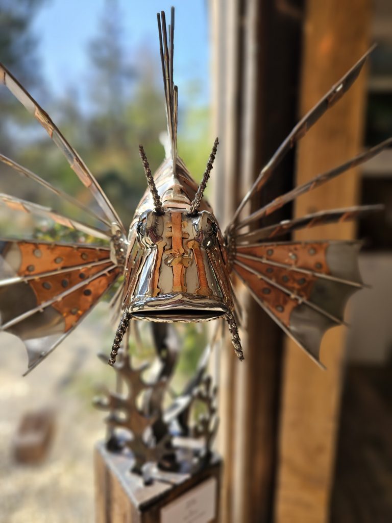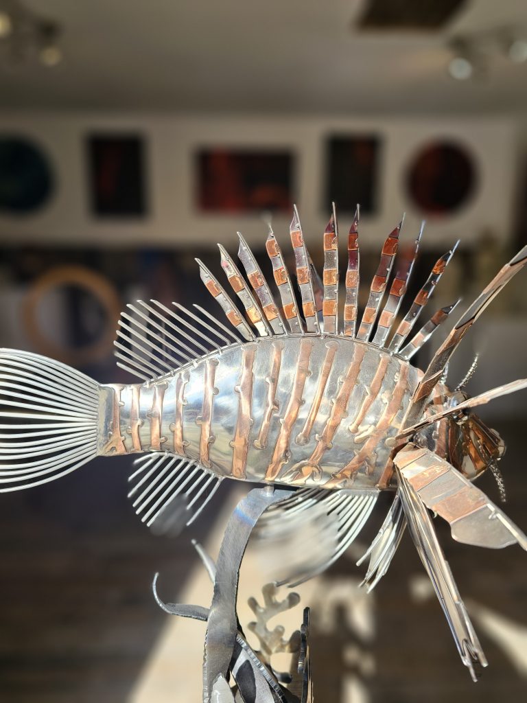 A detailed metal sculpture of a lionfish, constructed from polished marine steel with copper accents. The body has a smooth, reflective finish, contrasted by the radiating fins formed from cut and shaped metal elements that extend outward in a spiked, fan-like arrangement.