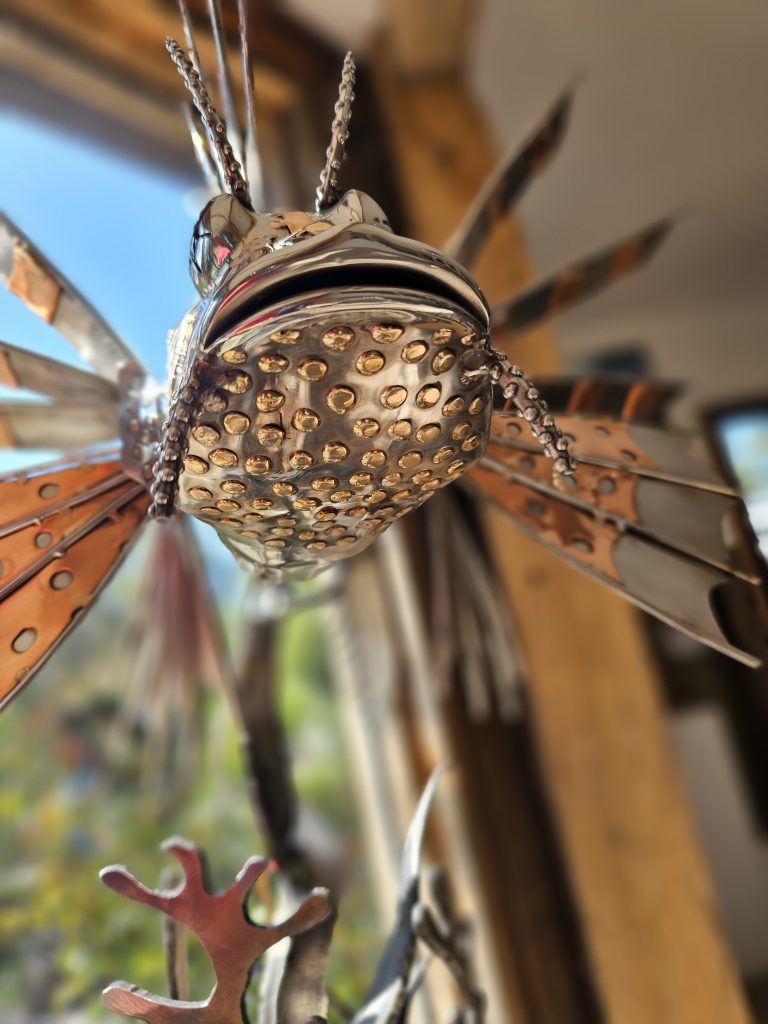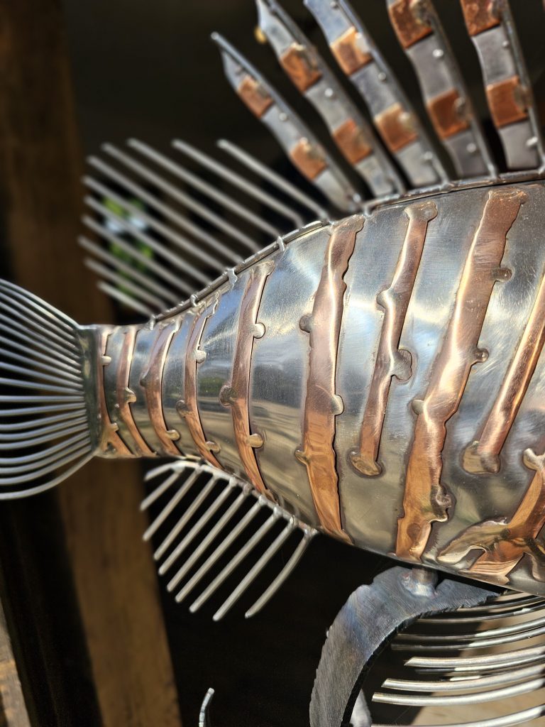 The fins are articulated with riveted sections and varied tones, creating pattern and structural definition. The head is stylised with raised detailing and projecting elements that suggest the species’ distinctive features.