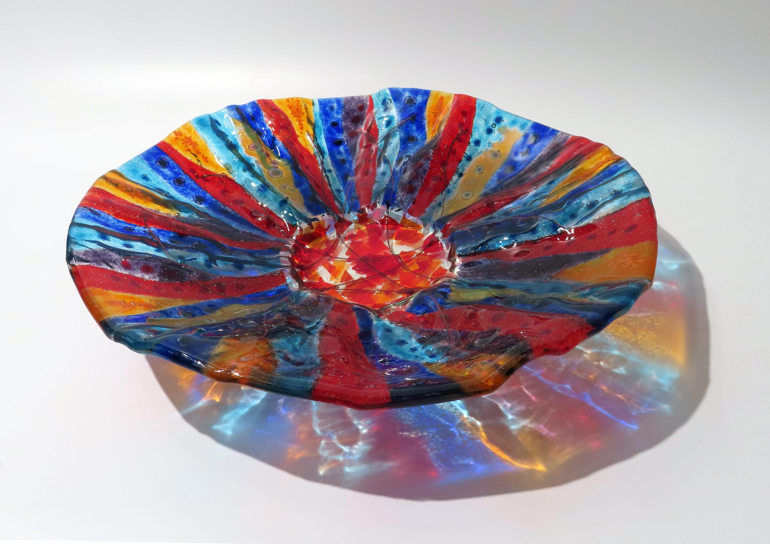 Fused and slumped glass with silver leaf and copper wire inclusions.