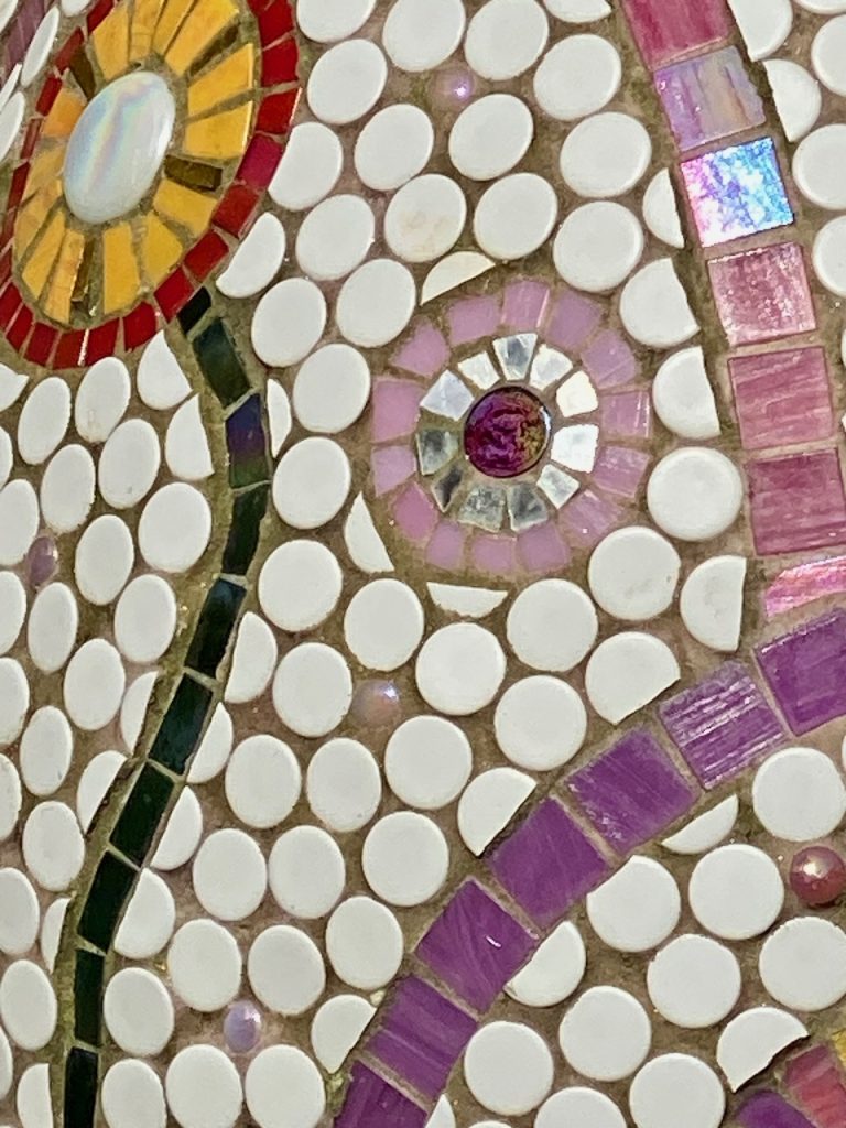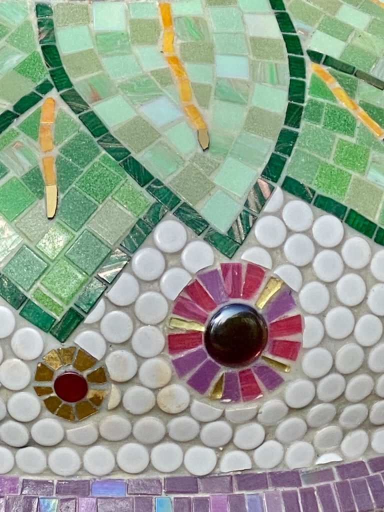 Vitreous glass and smalti glass mosaic combined with glazed ceramic beads and Venetian gold. Glitter grout.