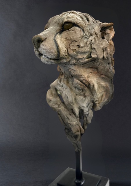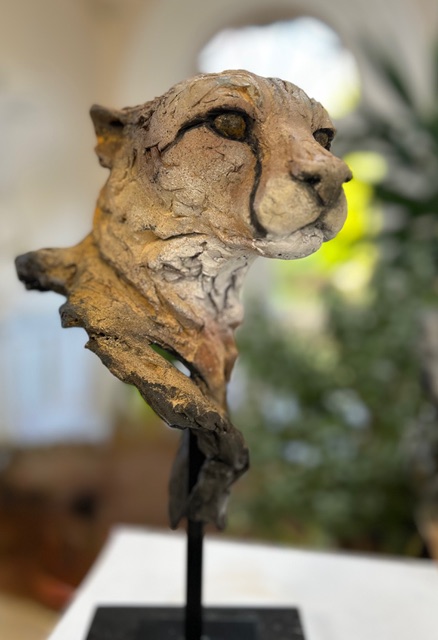 The cheetah’s calm yet focused gaze conveys both elegance and alertness — the quiet concentration of one of nature’s most extraordinary hunters. Emerging from a textured, almost raw form, the head appears to rise naturally from the material, blending strength with grace.