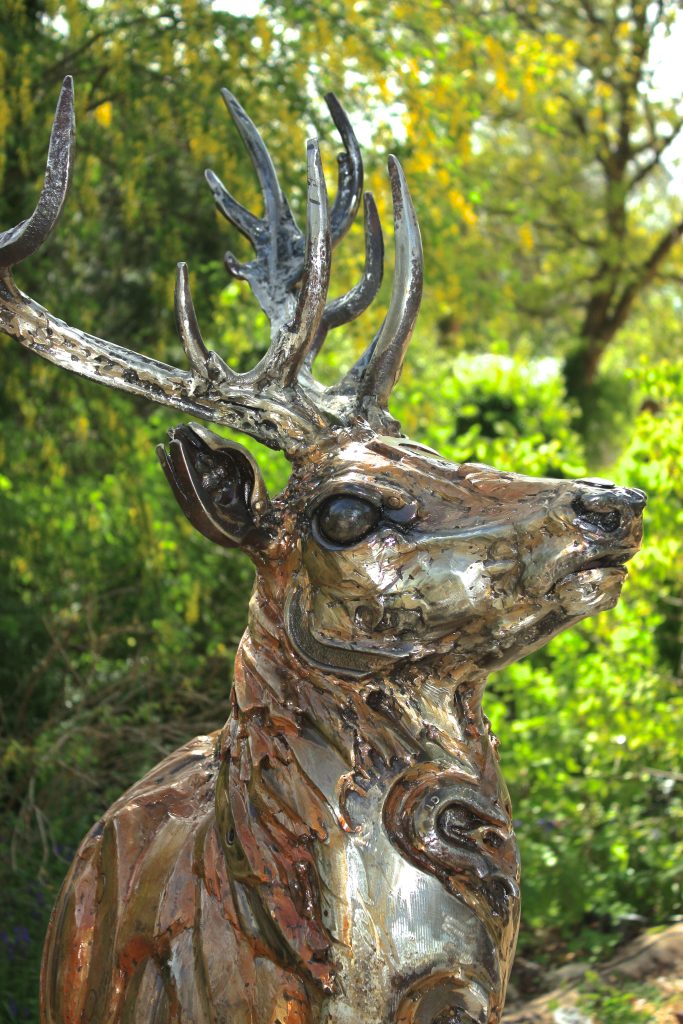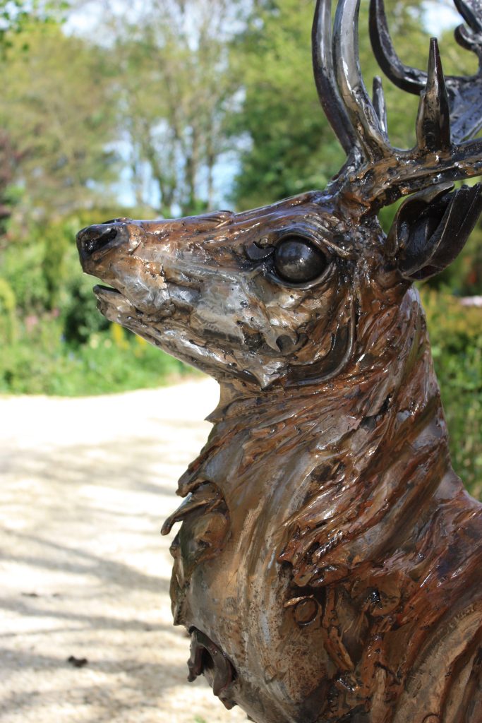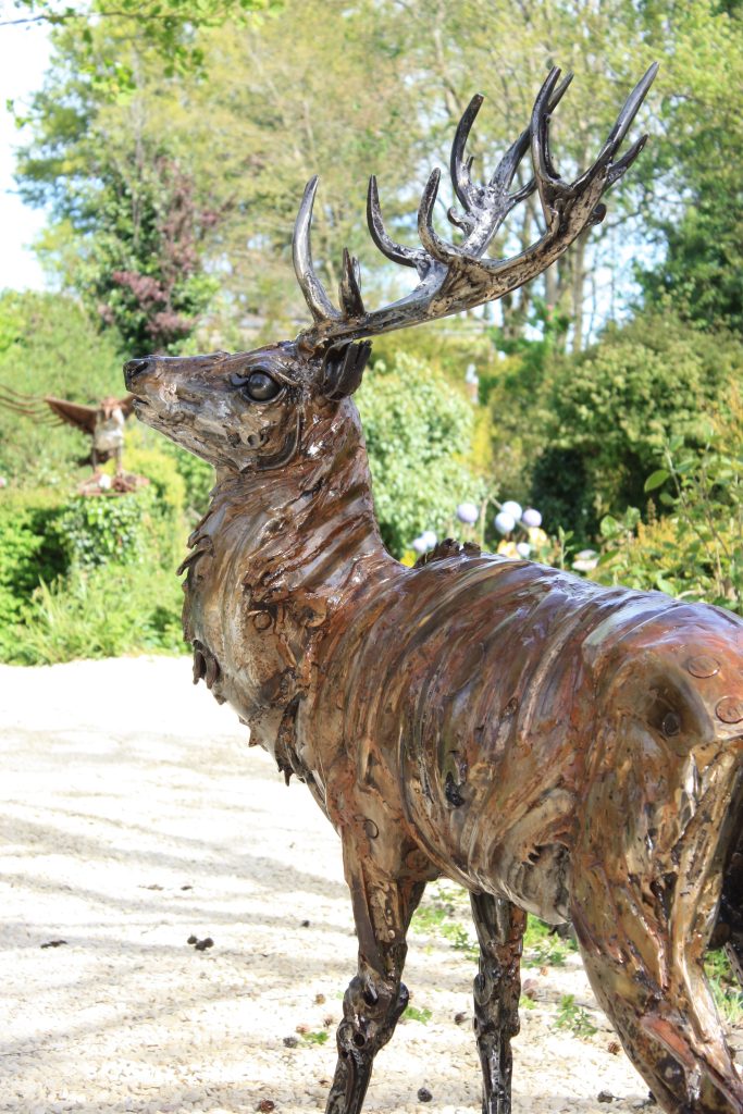 A sculpture of a proud red stag made from recycled tools and scrap metal in Crane’s distinctive style.