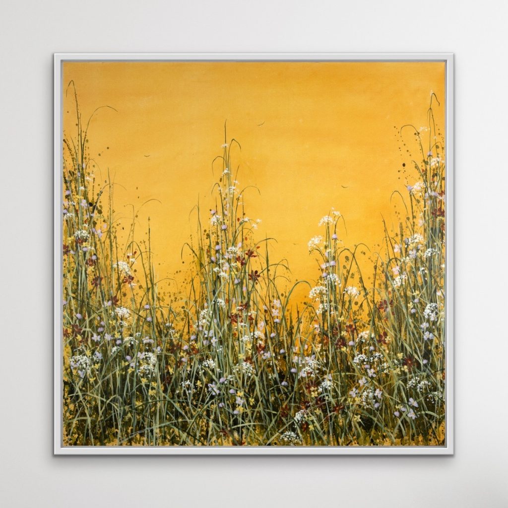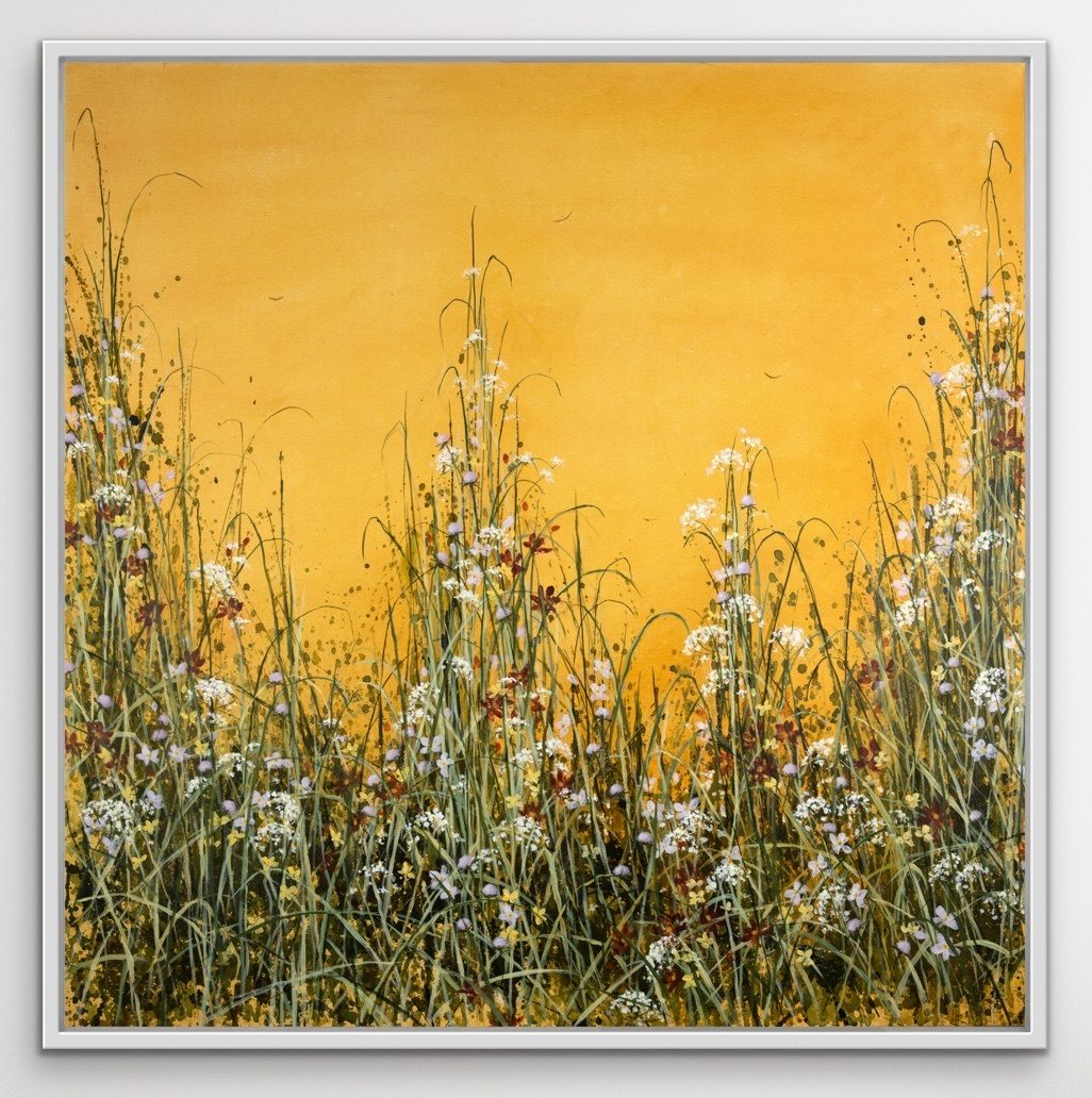 Acrylic and acrylic ink on canvas in a white boxed frame.