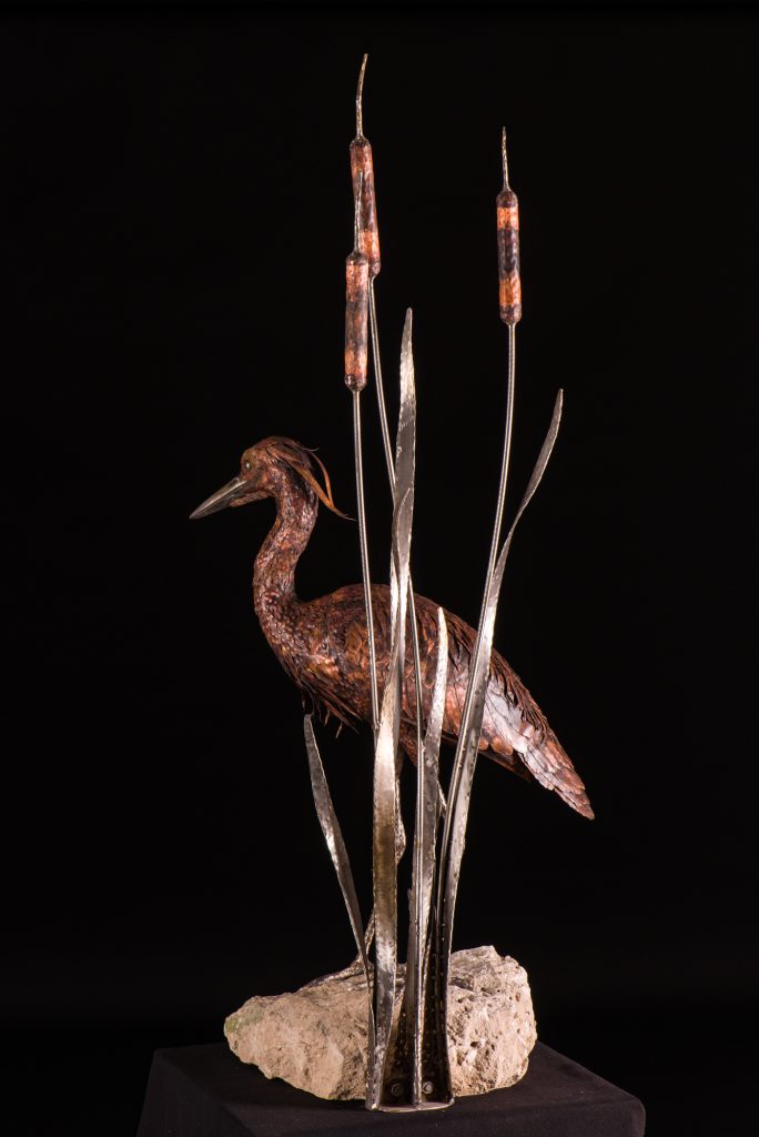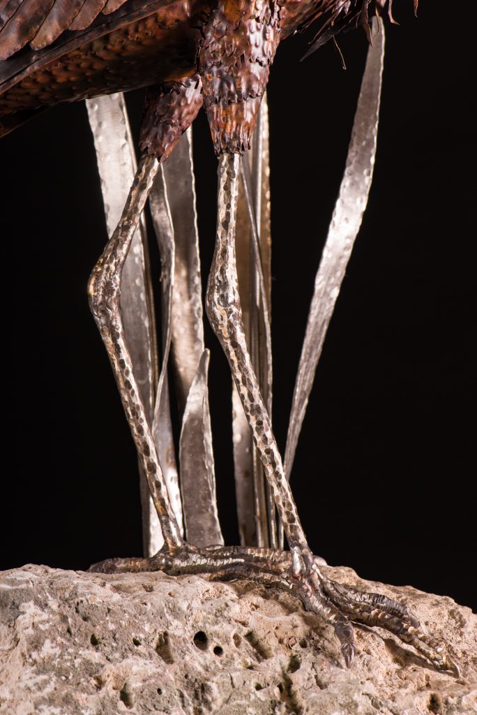 A sleek stylised bird sculpture with elongated form and outstretched wing, poised delicately on a textured base. Cast in dark patinated bronze, the piece captures the elegance and balance of a bird in motion, combining minimalist design with naturalistic detail. This contemporary wildlife sculpture evokes grace, movement and quiet observation.