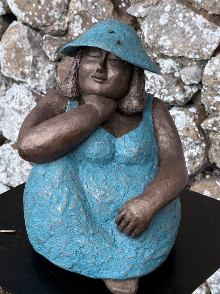 The soft, rounded forms and textured turquoise dress give the sculpture warmth and character, while the tilted hat adds a playful charm. Full of personality and calm humour, Day Dreamer celebrates the simple joy of drifting away into one’s own thoughts.