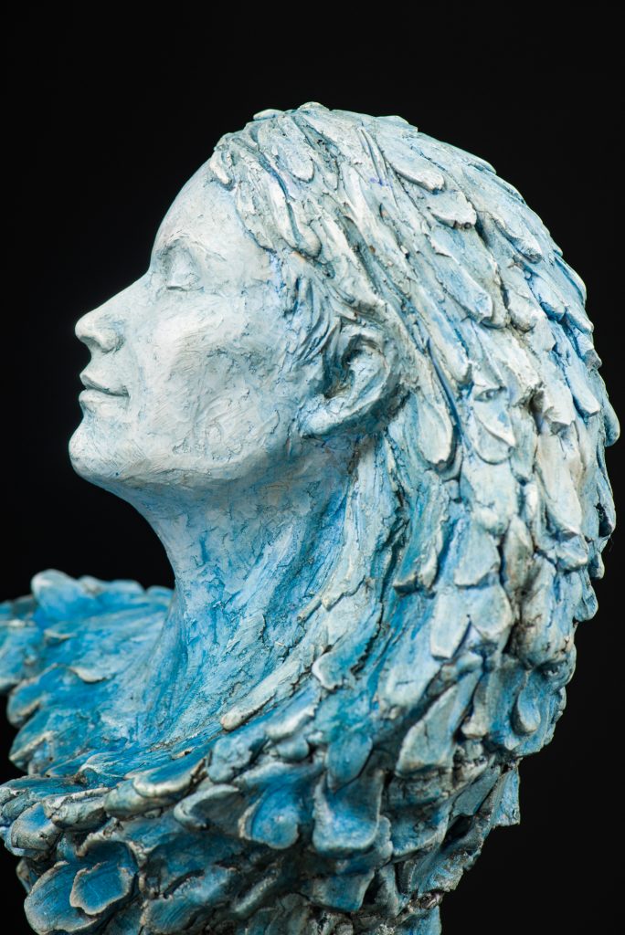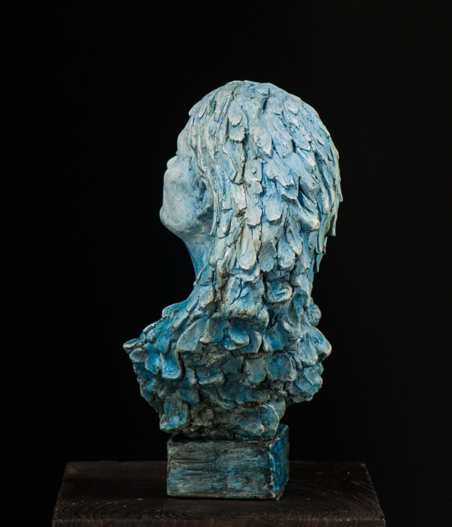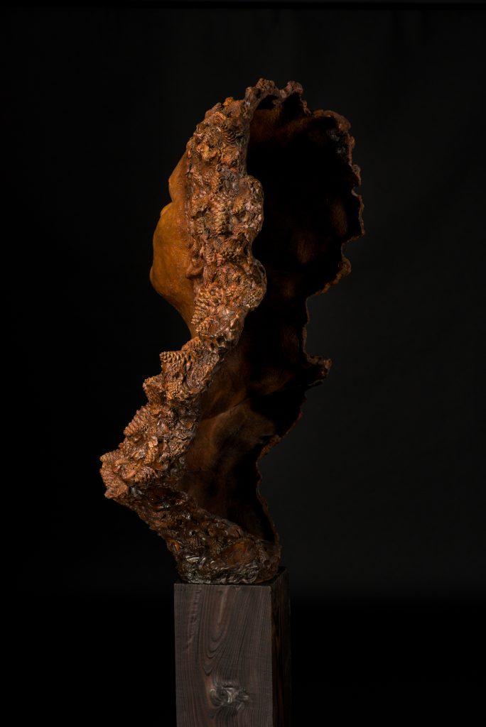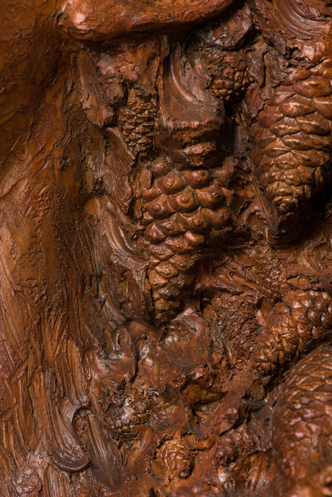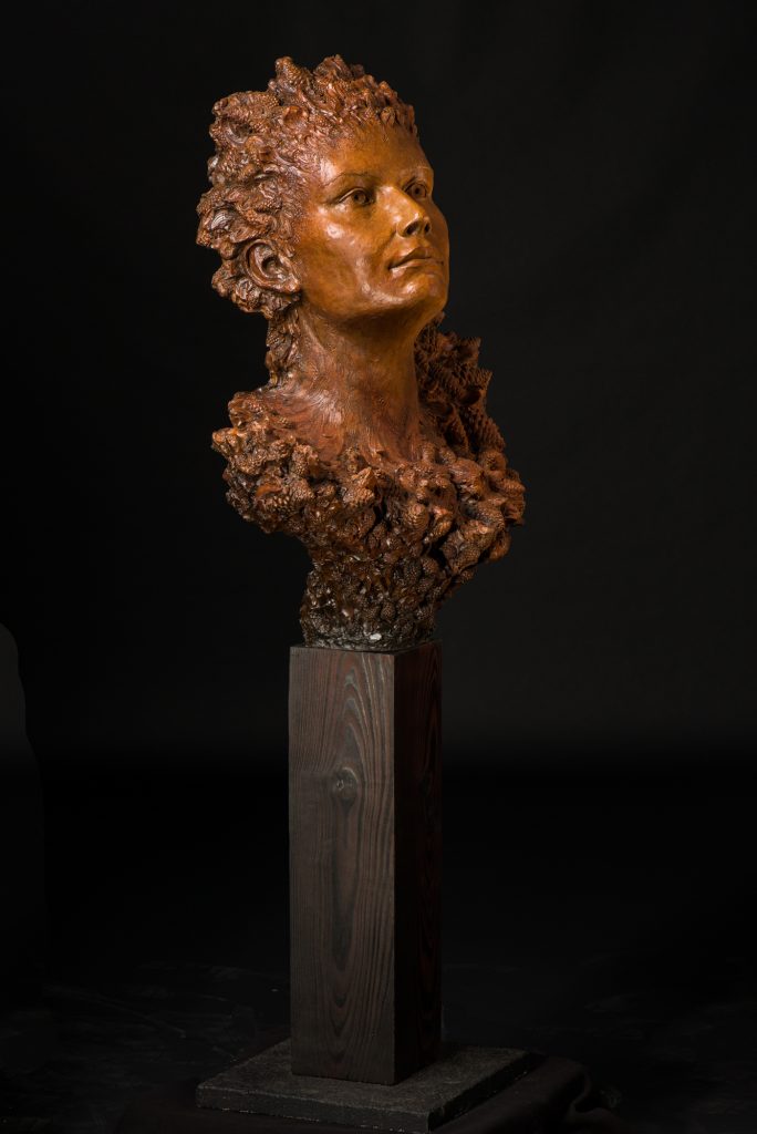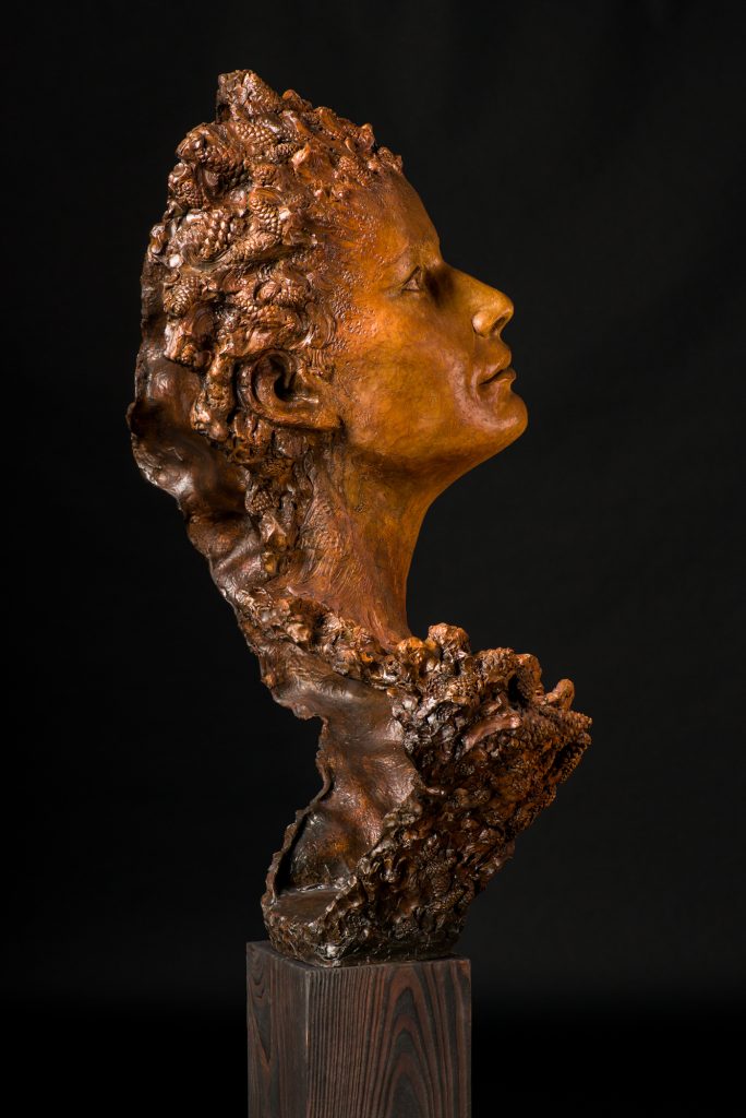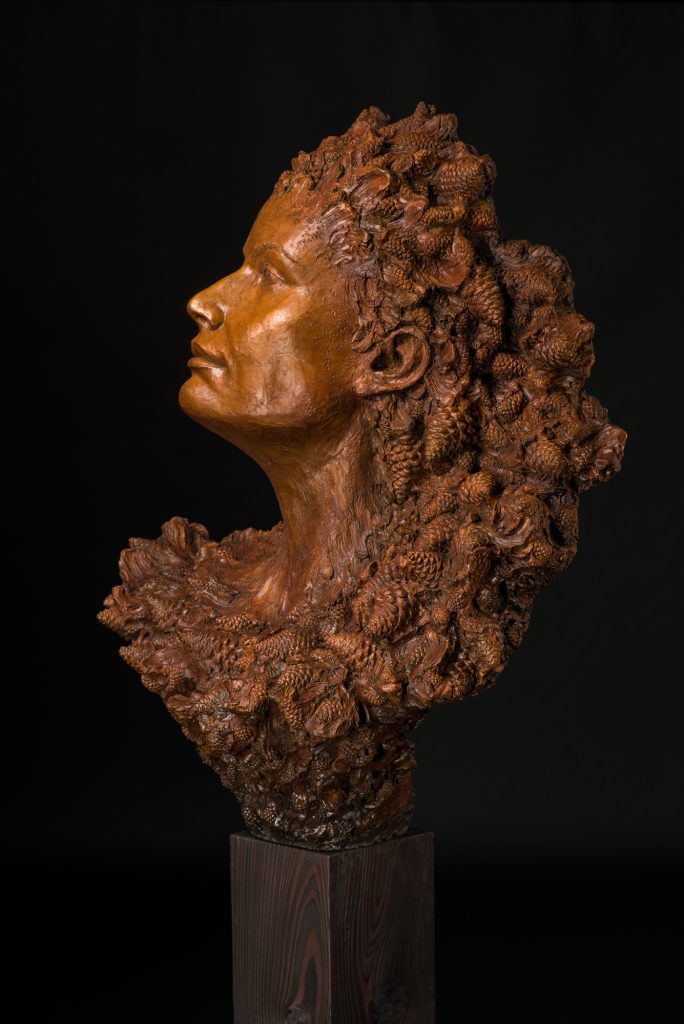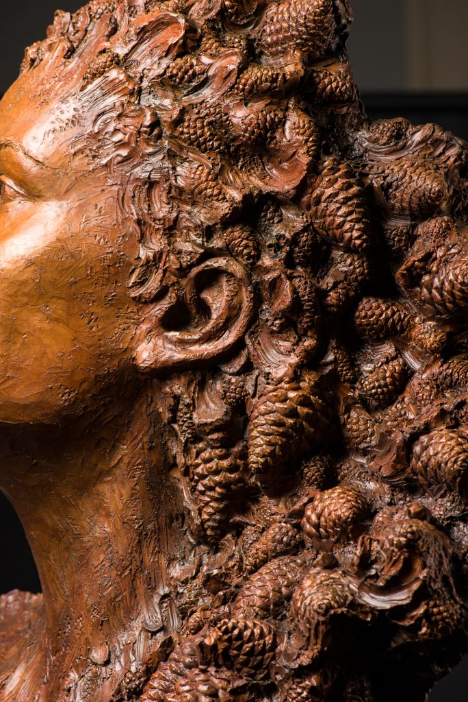 In this sculpture, I embedded pinecones within a female bust as she awakens and lifts her gaze to the sky. Is she experiencing enlightenment, transformation, regeneration or something more personal? The moment of awakening is left for the viewer to interpret.” – Brendon Murless