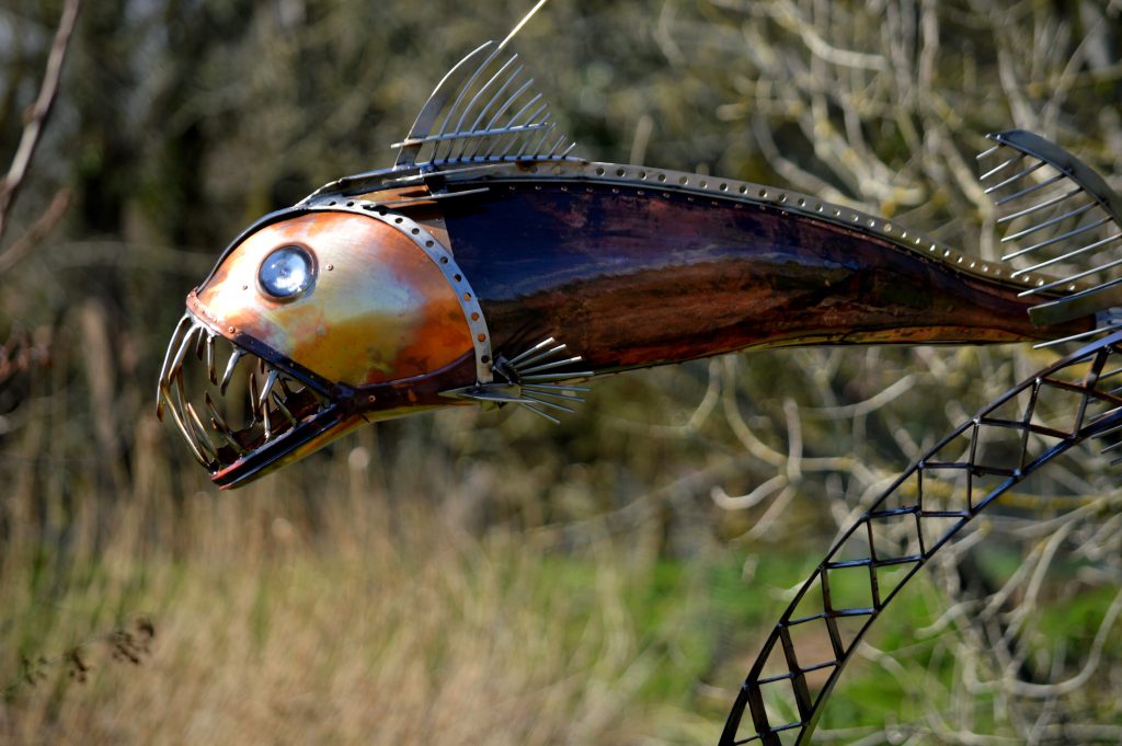 A sculptural interpretation of a pike, constructed from recycled stainless steel with a textured, scaled surface and elongated body. The form is supported on a series of vertical metal elements, raising it above a rectangular wooden base.