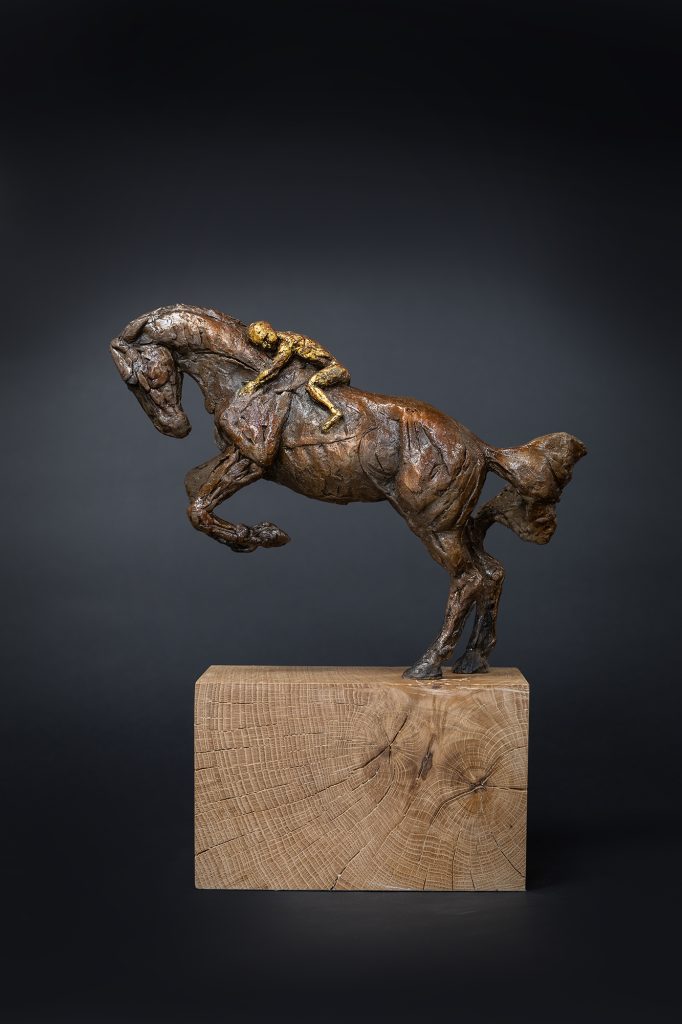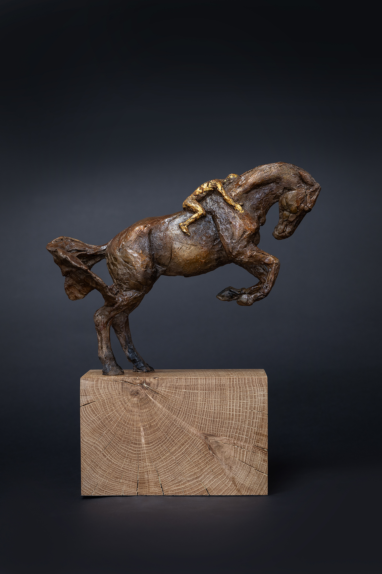 Cold cast bronze with metal leaf on a waxed oak base.